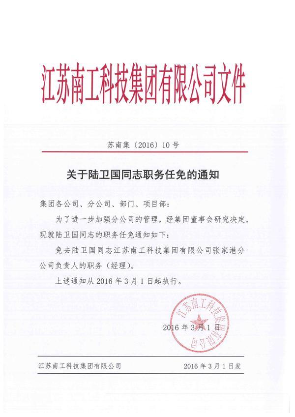 关于陆卫国同志职务任免的通知