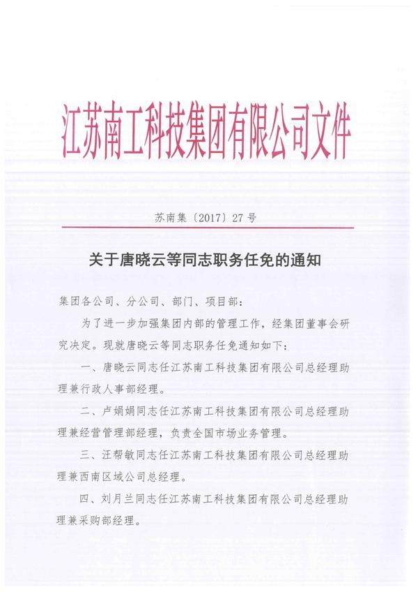 您的位置:集团首页 >> 新闻中心 >> 集团公告 >> 关于唐晓云等同志职务任免的通知