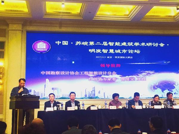 2017年11月3日,中国·苏皖第二届智能建筑学术研讨会明发智慧城市论坛在南京明发国际大酒店召开。参加研讨会的嘉宾有中国勘察设计协会智能设计工程分会会长胡萍,《数据中心数据规范》标准编写组组长钟景华,中国勘察设计协会智能设计工程分会湖北省专家委员会主任熊江、安徽省专家委员会主任万力、山东省专家委员会主任张钊、江苏省专家委员会主任管清宝,江苏多多28科技集团有限公司执行董事陈俊桦及集团副总经理吴雪峰等近300多人参加了研讨会。
