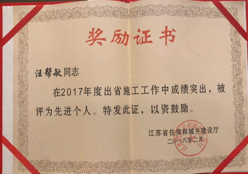 2018年3月25日,江苏省住房和城乡建设厅出省施工企业先进集体和个人西南地区表彰大会在重庆隆重召开。江苏多多28科技集团有限公司总经理助理兼重庆分公司总经理汪帮敏荣获2017年度出省施工工作“先进个人”称号。