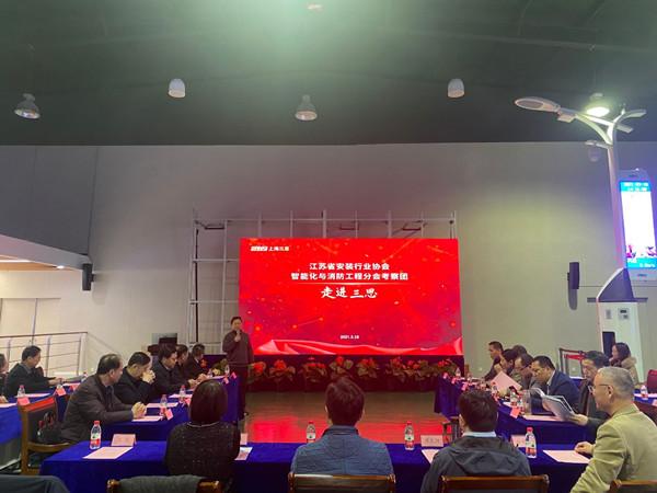 2021年3月18-19日,江苏省安装行业协会智能化与消防工程分会组织部分企业到上海三思电子工程有限公司考察。考察团一行在上海三思电子工程有限公司副董事长陈鸣、董事王彪、副总经理张佰明等陪同下考察了三思上海总部和在嘉善的工厂。