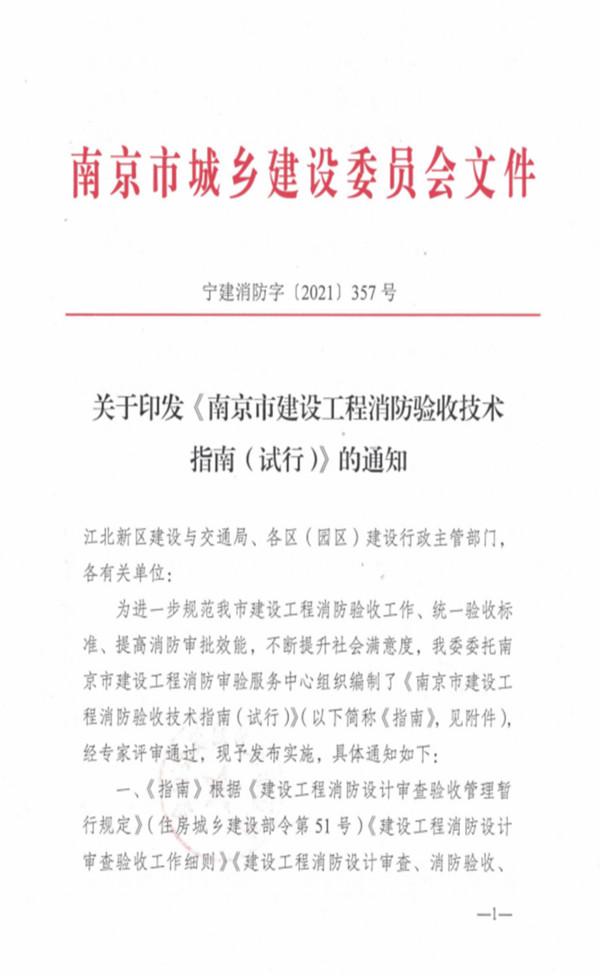 12月22日,南京市城乡建设委员会正式发布《南京市建设工程消防验收技术指南》,从2022年1月1日起开始试行。