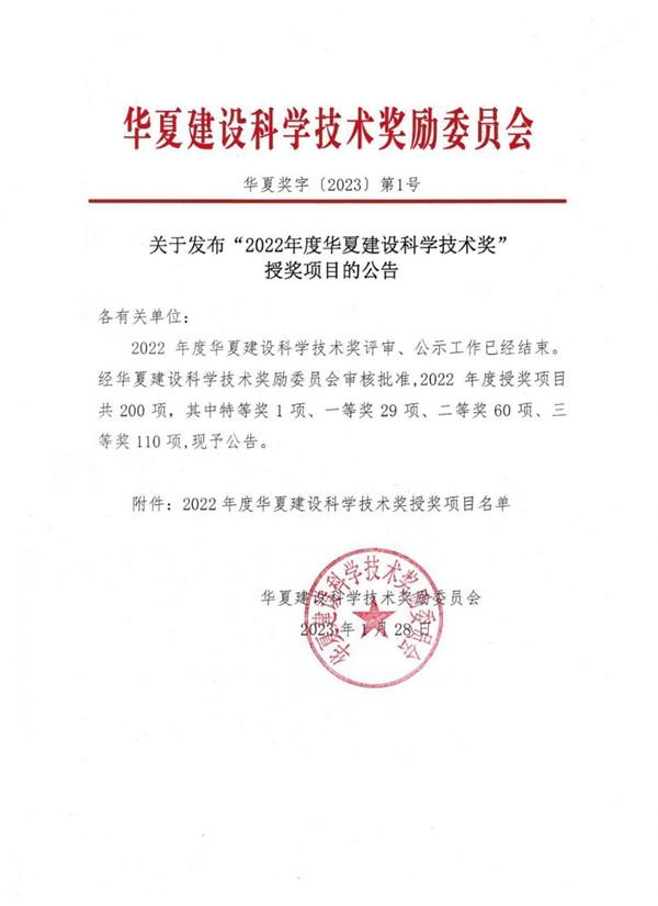 2023年1月28日,2022年度华夏建设科学技术奖正式发布,集团参编的《建设工程消防验收技术指南》荣获《华夏建设科学技术奖》三等奖。