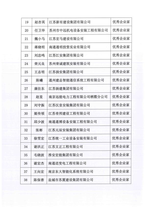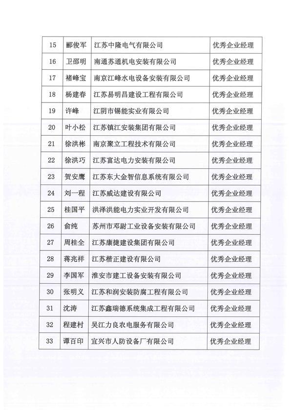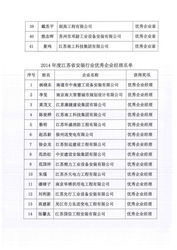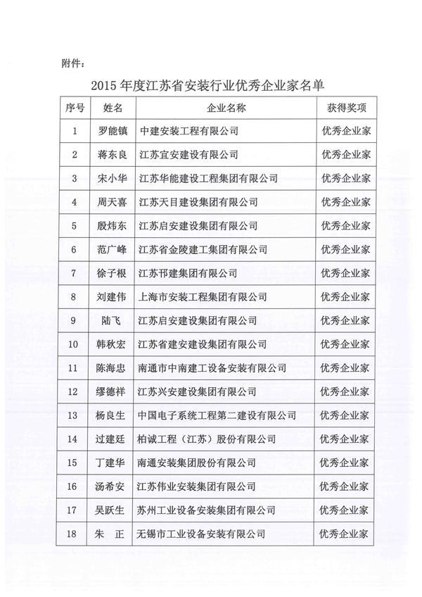 关于表彰2015年度江苏省安装行业优秀企业家(优秀企业经理)的决定